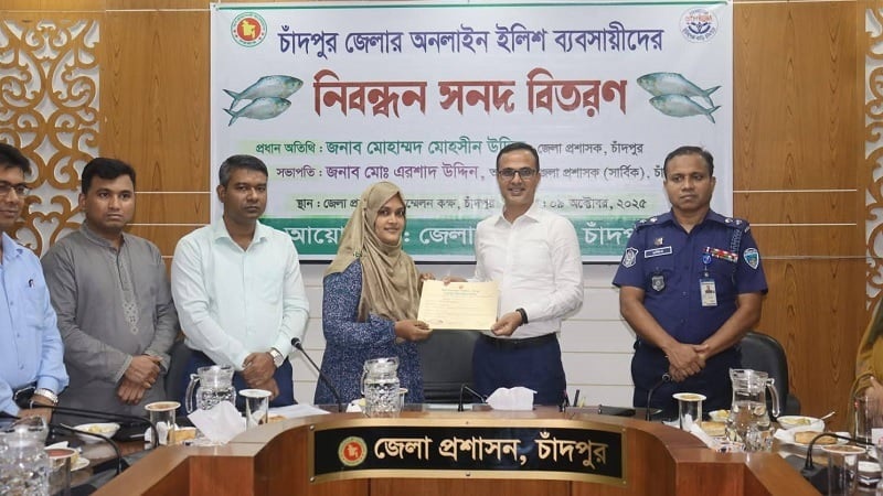 গতকাল বৃহস্পতিবার ৮ শর্তে অনলাইন ইলিশ ব্যবসায়ীর হাতে নিবন্ধন সনদ তুলে দেন জেলা প্রশাসক মোহাম্মদ মোহসীন উদ্দিন। এ সময় পুলিশ সুপার মুহম্মদ আব্দুর রকিবসহ অন্যরা উপস্থিত ছিলেন।