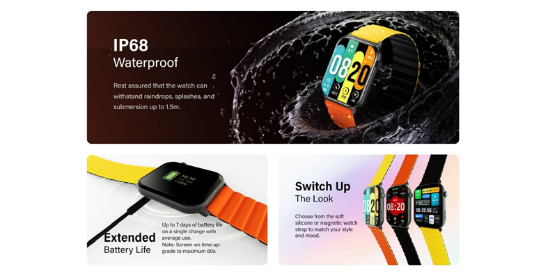 স্লিম মেটাল বডির চারকোণা আকৃতির ডিজাইনের স্মার্টওয়াচটিতে রয়েছে ১.৭৮ ইঞ্চির ৩৬৮*৪৪৮ পিক্সেলের অ্যামোলেড ডিসপ্লে, যাতে রয়েছে অলওয়েজ-অন-ডিসপ্লে (এওডি) ফিচার। ডিসপ্লেটির বিশেষত্ব হচ্ছে, এটি স্পিল্ট ডিসেপ্ল। অর্থাৎ এক সঙ্গে স্মার্টওয়াচটির ডিসপ্লে দুটি অংশে ভাগ করে ব্যবহার করা যাবে। খুবই স্মুথভাবে ডিসেপ্ল ব্যবহারের পাশাপাশি দেবে স্বচ্ছ দেখার অভিজ্ঞতা। এমনকি রোদেও এটি খুব সহজেই চোখে পড়বে।