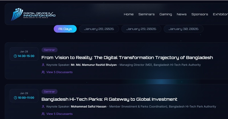 টেকভিশন২৪ ডেস্ক: আগামী ২৮ জানুয়ারি থেকে শুরু হতে যাচ্ছে দেশের সর্ববৃহৎ তথ্যপ্রযুক্তি প্রদর্শনী ‘ডিজিটাল ডিভাইস অ্যান্ড ইনোভেশন এক্সপো ২০২৬’। রাজধানীর বাংলাদেশ-চীন মৈত্রী সম্মেলন কেন্দ্রে চার দিনব্যাপী এই প্রদর্শনী যৌথভাবে আয়োজন করছে তথ্য ও যোগাযোগ প্রযুক্তি বিভাগ, বাংলাদেশ হাই-টেক পার্ক কর্তৃপক্ষ এবং বাংলাদেশ কম্পিউটার সমিতি (বিসিএস)।