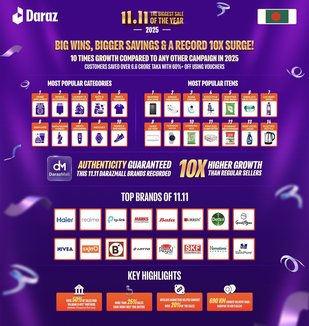 অনবদ্য সাশ্রয়, ডিজিটাল পেমেন্টের দ্রুত বিকাশ, ব্র্যান্ডগুলোর ব্যাপকঅংশগ্রহণ এবং দারাজমলের রেকর্ড সাফল্যের মধ্য দিয়ে ১১.১১ ক্যাম্পেইন২০২৫ আবারও প্রমাণ করলো যে, দারাজ বাংলাদেশই দেশের সবচেয়েনির্ভরযোগ্য অনলাইন শপিং গন্তব্য এবং ক্রেতা-বিক্রেতা ও ব্র্যান্ডগুলোরজন্য বছরের সবচেয়ে বড় উৎসব।