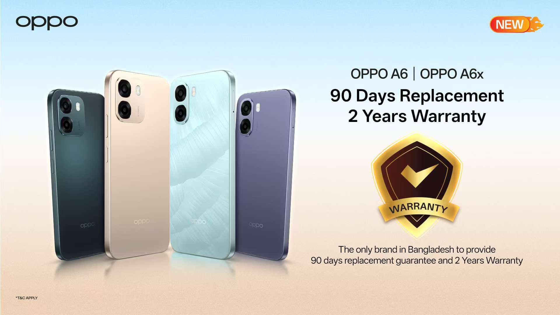 বাংলাদেশে প্রথমবারের মতো অপো এ৬ বা এ৬এক্স কেনা ক্রেতারা সম্পূর্ণ ৯০ দিনের রিপ্লেসমেন্ট সাপোর্ট উপভোগ করতে পারবেন। যা আগে কখনও পাওয়া যায়নি এমন মানসিক প্রশান্তি দেবে।